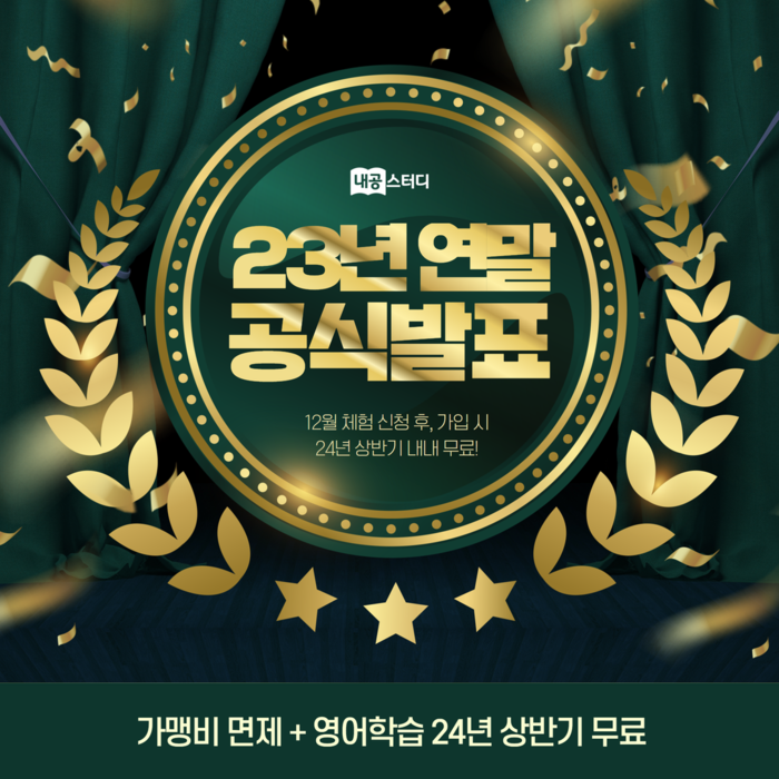[시민일보 = 이창훈 기자] 전국 6500여개 학원에 서비스 중인 영어 온라인영어학습 ‘내공스터디‘가 2023년 연말을 맞이해 오는 31일까지 역대급 연말 총 결산혜택을 지원한다.