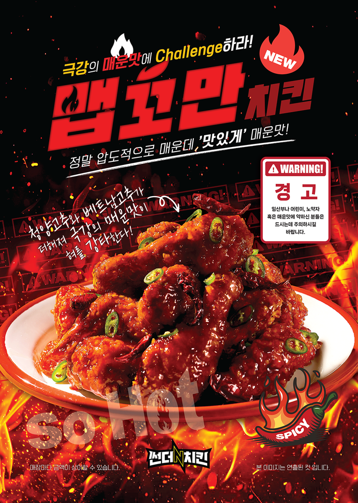 ‘맵꼬만 치킨’은 일반적인 매운맛을 넘어선, 극한의 매운맛을 콘셉트로 개발된 신메뉴로, 한 입만 먹어도 강렬한 자극이 입안을 휘감는 것이 특징이다. 썬더치킨은 “매운맛에 자신 있는 고객, 혹은 새로운 미각 도전을 원하는 소비자를 위해 기획한 메뉴”라고 설명했다.