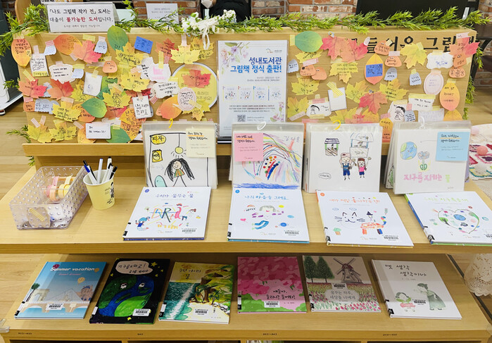 | ▲ 성내도서관에 전시된 ‘나도 그림책 작가전’ 에 출품된 책들.(사진=강동구청 제공) |