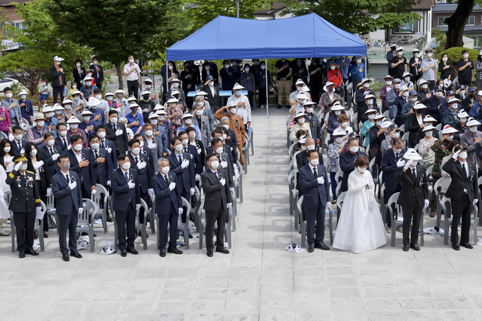 사회적 거리두기가 전면 해제되면서 2년만에 보훈 유가족 및 군민 모두가 함께한 이번 추념식은 오전 10시 전국적으로 울리는 사이렌 취명에 맞춰 조총발사, 1분간 순국선열 및 호국영령에 대한 묵념을 시작으로 헌화와 분향, 추념사, 추모헌시 낭송에 이어 현충일 노래 제창 순으로 진행됐다.