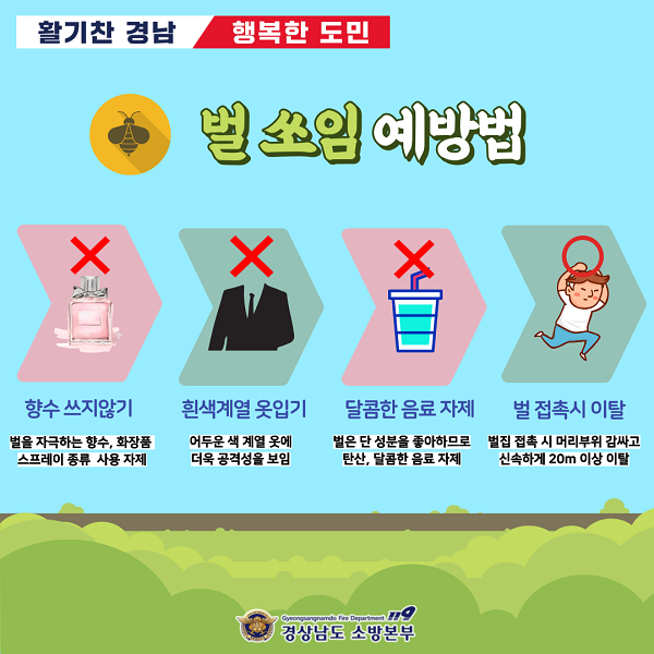 조형용 합천소방서장은 “여름철 벌이 집중해 활동하는 시기이므로 야외활동에 주의하고 벌 쏘임 사고 예방을 위하여 안전 수칙을 준수해 달라”고 전했다.