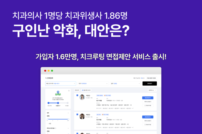 치과 전문 구인구직 플랫폼 ‘치크루팅’(대표 송언의)이 치과 인력 구인난 해결을 위해 ‘면접제안 서비스’를 출시했다고 11일 밝혔다.