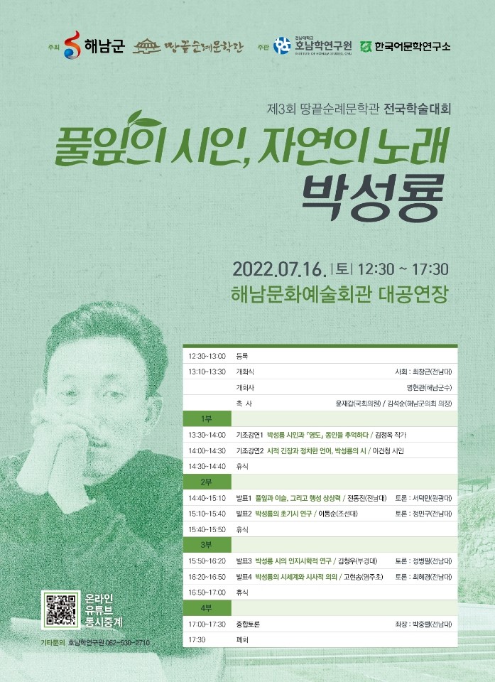 오는 7월 16일 해남문화예술회관 대공연장에서 열리는 학술대회는 해남의 대표 문인이자 한국 서정시의 새로운 길을 개척한 박성룡 시인의 삶과 문학세계를 주제로 하고 있다. 추모 20주기를 맞아 박성룡 시인을 연구하는 최초의 학술대회로 관심을 모으고 있다.