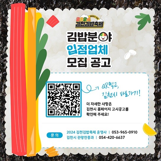 [김천=박병상 기자] 김천시는 10월말 개최 예정인『2024 김천김밥축제』참여업체를 8. 12.(월)부터 8. 30.(금)까지 모집한다고 밝혔다.