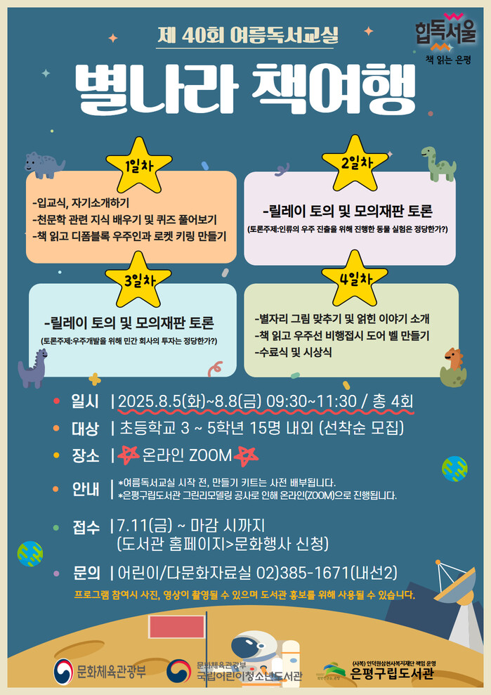 주요 프로그램으로는 △천문학 기초 학습 및 퀴즈 △릴레이 토론과 모의재판 △우주선 도어 벨 만들기 체험 등이 마련돼, 책과 과학 그리고 토론이 어우러진 활동을 통해 놀이와 학습이 자연스럽게 연결되는 독서문화 체험이 될 전망이다.