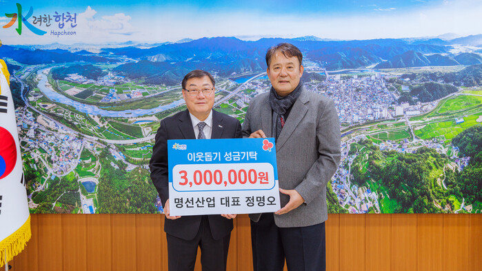 김윤철 합천군수는 “지역사회의 어려운 이웃들을 위해 따뜻한 나눔을 실천해주셔서 감사드리며, 전달해주신 성금은 추운 겨울 도움이 필요한 이웃에게 잘 전달되도록 하겠다”고 감사의 마음을 전했다.