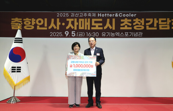 | ▲ 의왕시는 지난 9월 5일 충북 괴산군에서 개최된 ‘2025 괴산고추축제’에 방문해 의왕시 고향사랑기부제를 홍보하고 괴산군과의 상호 기부를 약속했다 /사진제공=의왕시 |