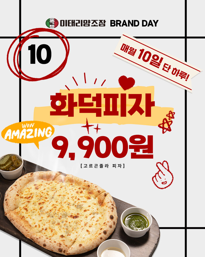 이태리양조장은 매월 10일 단 하루 동안만 고르곤졸라 피자를 9900원의 할인된 가격에 제공하는 브랜드데이 프로모션을 진행하며, 달콤하고 고소한 치즈 풍미로 남녀노소 모두 부담없이 즐길 수 있는 고르곤졸라 피자를 가성비 좋은 가격에 제공한다.