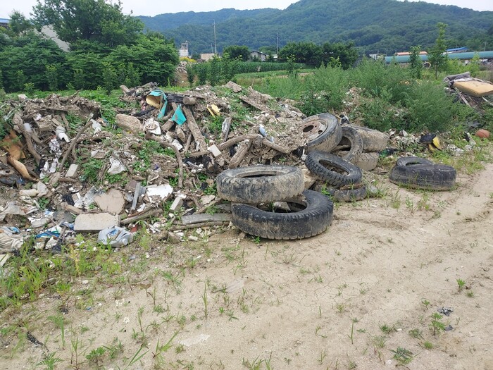이곳에 방치되어 있는 폐콘크리트는 폐아스팔트와 함께 썩여 방치되어 있고 혼합 건설폐기물은 폐목.스티로폼.부직포.비닐.폐타이어 등 종류도 다양하게 여러 가지의 품목이 뒤섞인 채 있고 버려진지 오래된 듯 폐자재 위에는 잡초가 자라 숲을 이루고 있다.