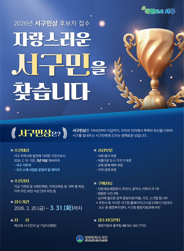 고진희 행정지원과장은 “서구민상은 보이지 않는 자리에서 묵묵히 지역을 위해 헌신해 온 분들을 기리는 상”이라며 “주민 여러분의 적극적인 관심과 추천을 바란다”고 말했다.