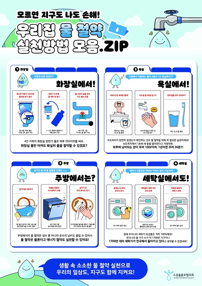 이정삼 상수도사업본부장은 “양변기 수조에 물 채운 페트병을 넣거나 몰아서 세탁하기, 샤워시간을 최대한 줄이는 등 일상 속 작은 노력으로도 얼마든지 물은 절약할 수 있다”며 “시민들이 자발적으로 적극 참여해주기를 바란다.”고 말했다.