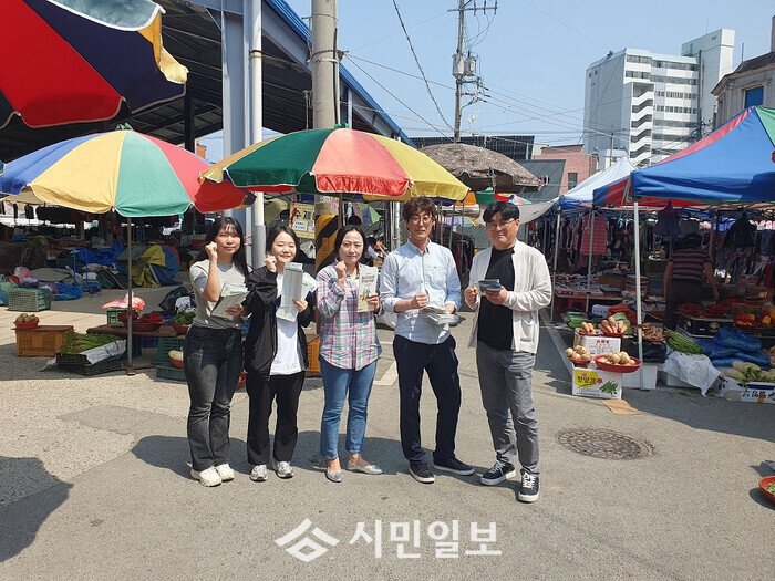 | ▲ 한국농어촌공사 해남완도지사 임직원, 지난 26일 해남읍 고도리 소재 전통시장에서 농지은행사업 홍보 기념촬영 / 해남완도지사 제공 |