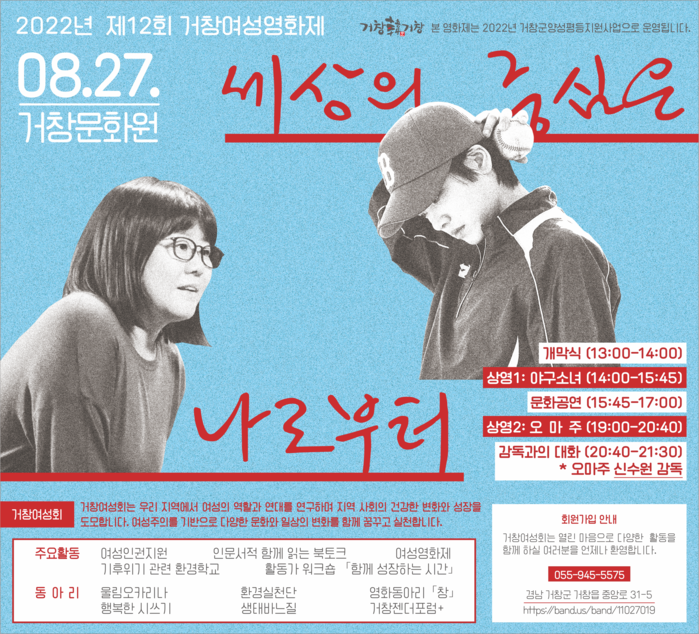 거창여성회에서 주관하는 거창여성영화제는 올해로 제12회를 맞이하였다. 거창여성회는 거창 지역에서 여성의 역할과 연대를 연구하며 지역 사회의 건강한 변화와 성장을 도모하는 여성 모임이다. 여성주의를 기반으로 다양한 문화와 일상의 변화를 함께 꿈꾸고 실천하고자 한다.