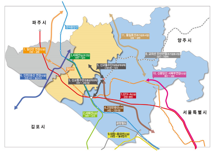 고양은평선(고양시청~새절역), 인천2호선 일산서구 연장(일산서구~인천서구), 일산선 연장(대화~금릉), 신분당선 서북부연장(삼송~용산), 대장홍대선(부천대장~홍대입구)뿐만 아니라 조리금촌선(통일로선, 삼송~금촌), 교외선(능곡~의정부)이 포함돼 고양시가 건의한 사업 7개 노선이 모두 최종 확정됐다.