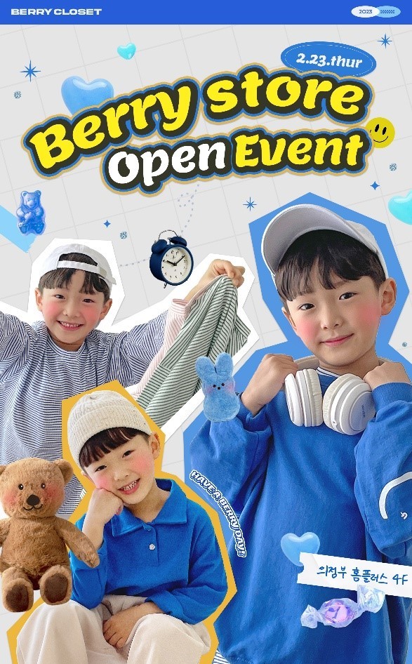 [시민일보 = 이창훈 기자] 아동복 전문 브랜드 베리클로젯이 첫 번째 오프라인 매장 ‘의정부점’을 지난 23일에 가오픈했으며, 28일 월요일 정식 오픈한다. 이를 기념하여 이벤트를 진행한다고 27일 밝혔다.