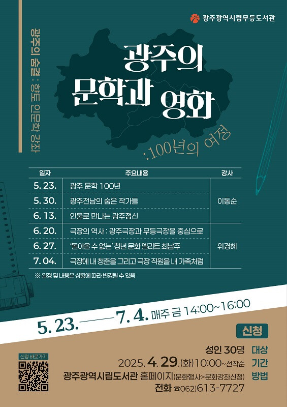 송경희 시립도서관장은 “이번 강좌는 ‘광주의 문화 100년’을 문학과 영화라는 키워드로 되짚으며 시민들에게 의미 있는 성찰의 기회를 제공한다”며 “광주의 정체성과 인문자산을 확산하는 데 기여하겠다”고 말했다.