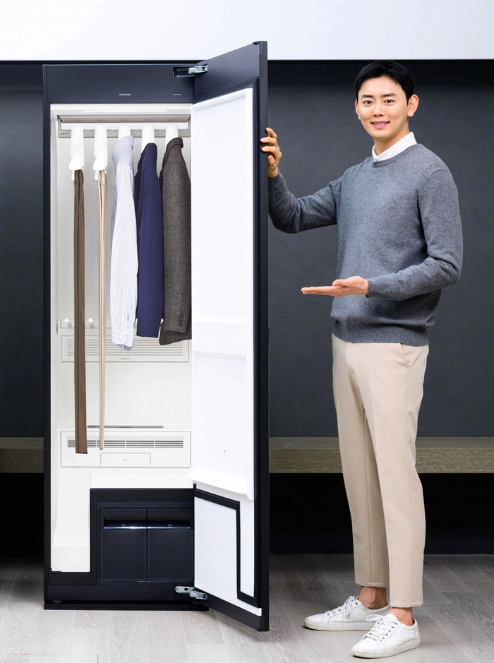 | ▲ 삼성전자 모델이 제품 외관 크기는 유지하면서도 한번에 관리 가능한 의류 수를 최대 9벌로 늘린 '비스포크 에어드레서' 대용량 모델 신제품을 소개하고 있는 모습.(사진제공=삼성전자) |
