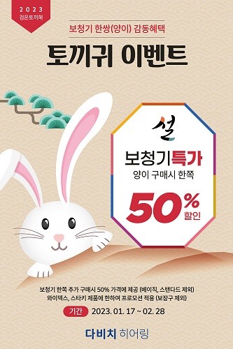 이벤트 기간은 1월 17일부터 2월 28일까지이며 해당 기간 동안 다비치보청기가 취급하는 해외 유명 브랜드 와이덱스, 스타키의 다양한 보청기 제품을 양이구매 시 한쪽 50% 할인 특가 가격으로 구매할 수 있다.