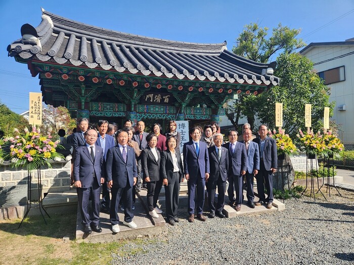 | ▲ 우승희 영암군수(사진 가운데)가 지난 2023년 일본 오사카 히라카타 왕인박사 묘전제에 참석해 관계자 등과 기념촬영을 하고 있다. / 영암군 제공 |