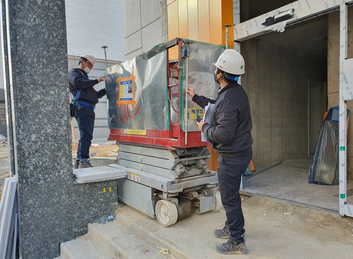 | ▲ 안전관리 담당자가 고소작업대 방호장치 점검을 하고 있다. (사진=부영그룹 제공) |