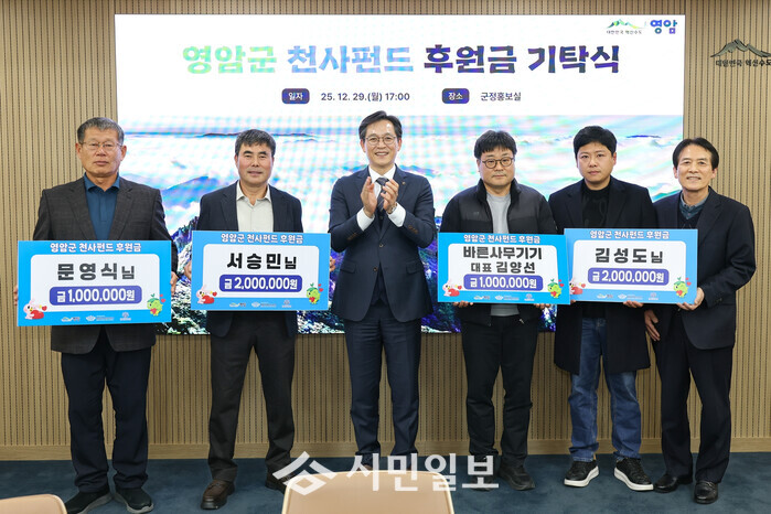 | ▲ 우승희 영암군수(왼 쪽부터 세 번째)가 지난 29일 영암군정홍보실에서 영암군의 한우경진대회 수상자와 지역기업 대표로부터 지역사회 상생 및 나눔 문화 확산의 하나로 열린 천사펀드 기탁식에서 총 600만 원을 기탁 받은 후 기념촬영을 있다./ 영암군 제공 |