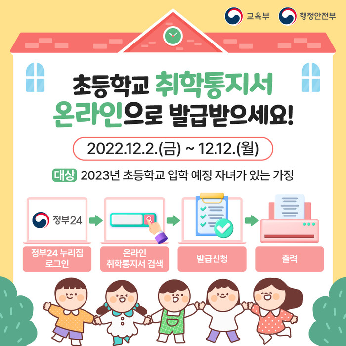 취학통지서는 온라인 인터넷과 해당 읍면동사무소 등기우편 두가지 방법으로 병행해 발급된다.