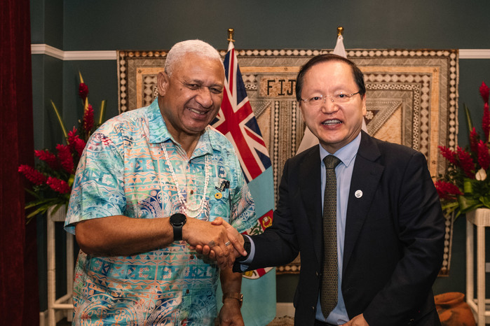 | ▲ 삼성전자 경영지원실장 박학규 사장(오른쪽)이 지난 11일 PIF 정상회의가 열린 피지 그랜드퍼시픽호텔에서 보렝게 바이니마라마 피지 총리를 만나 삼성전자 활동을 소개하고 2030 부산 엑스포 유치 지지를 당부했다.(사진제공=삼성전자) |