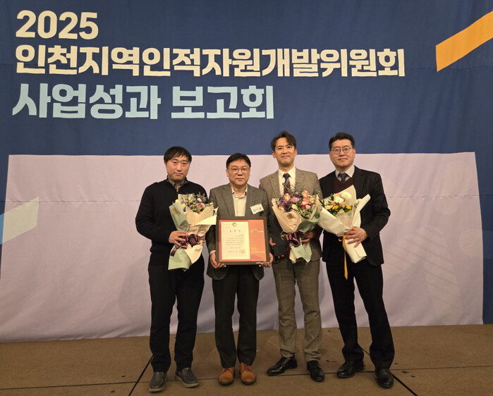 | 왼쪽부터 인천대 혁신인력개발센터 박주동 과장, 김재광 센터장, 정현규 과장, 엄효섭 팀장이 포즈를 취하고 있다. (사진=인천대) |