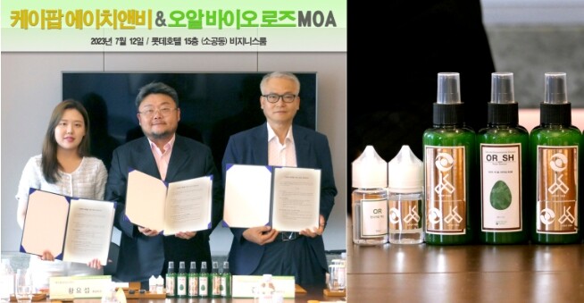 이미지 설명 : (좌)황유비 대표(케이팝에이치앤비) 황요섭 총괄회장(케이팝모터스) 김태우 회장(오알바이오로즈)/ (우) 신물질로 개발한 제품