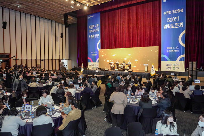| ▲ 지난 3월20일 수원컨벤션센터에서 진행된 통합돌봄 500인 원탁토론회에 참여한 시민들이 토론을 하고 있다.(사진=수원시청 제공) |