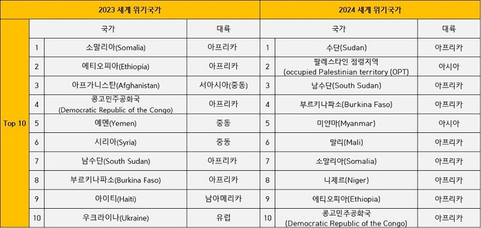 2024년의 위기국가 TOP10을 발표한 <2024 세계 위기국가 보고서>에서 1위로 선정된 수단의 경우, 작년에 발표된 세계 위기국가보고서에는 10위권 밖이었지만 대규모 도시 내 무력분쟁과 국제사회의 적은 관심, 주변 지역에의 파급력 등으로 2024년 위기가 더욱 악화될 것으로 예상하고 있다. 특히 분쟁 피해 지역 내 의료 시설의 70%가 폐쇄됨에 따라 질병 위험에 노출되고 있다. 이미 인도적 도움이 필요한 사람이 수단 인구의 약 54%인 2,500만 명에 이르고, 수단 인구의 약 12%인 510만 명이 삶의 터전을 잃고 난민이나 국내 실향민이 됐다.