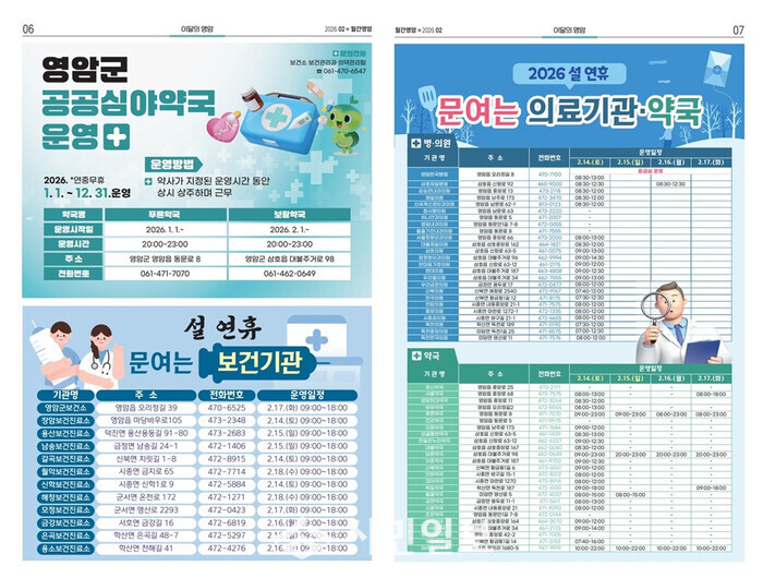 설 명절 연휴 기간 문 여는 병·의원과 약국은 영암군 반상회보 ‘월간영암’ 2월호, 영암군홈페이지 열린군정>영암소식>반상회보(월간영암)에서 볼 수 있다.