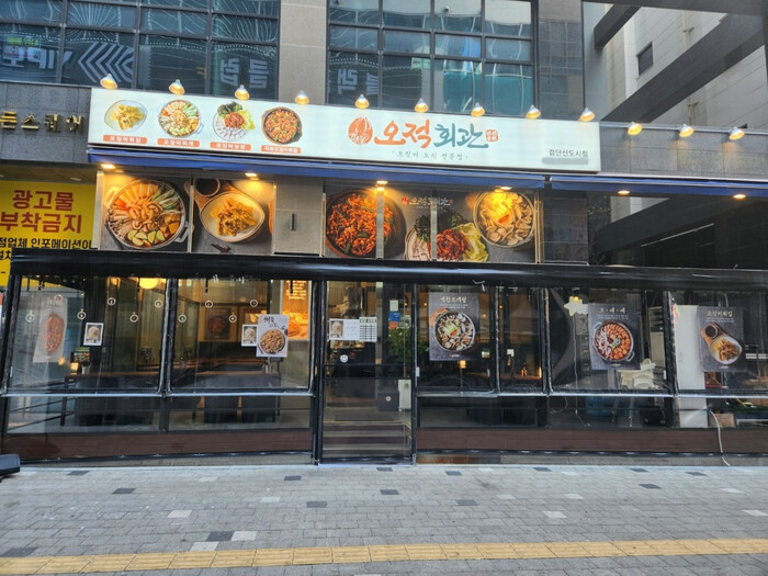 오적회관은 오징어 전문점으로 오징어볶음, 보쌈 등 식사와 주류를 한곳에서