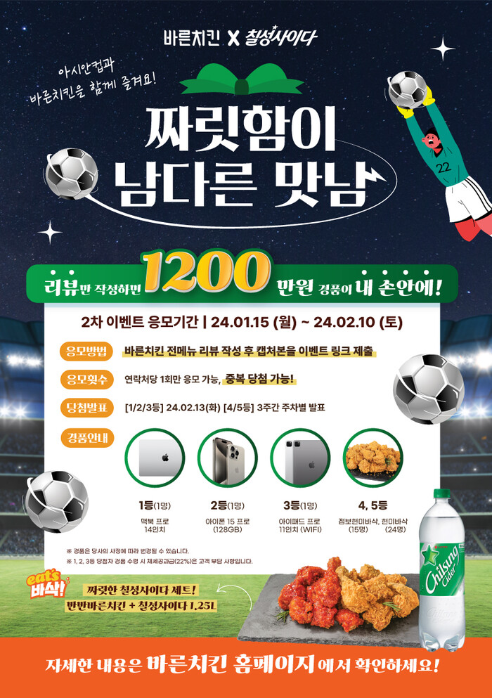 오는 10일까지 ‘짜릿함이 남다른 맛남’을 주제로 청량함의 상징인 칠성사이다와 바삭함이 남다른 바른치킨이 1,200만원 상당의 경품을 증정하는 리뷰 이벤트를 진행한다.