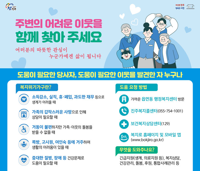 시는 이외에도 도움이 필요한 대상자들이 언제나 쉽게 비대면으로 복지상담을 할 수 있고, 정기적으로 복지정보를 받아볼 수 있는 ‘진주복지톡(TALK)’, 전력사용량 및 통신데이터를 수집·분석해 이상 패턴이 감지되면 읍면동 복지담당자에게 알림이 전달돼 신속하게 대처하는 ‘1인가구 안부 살핌 해피콜 서비스’, 사회적 고립 등으로 안부확인이 필요한 돌봄대상자에게 주기적인 안부전화와 희망메세지를 발송하는 ‘안녕하세요! 희망 안부콜 서비스’ 등 다각적 지원을 추진하고 있다.