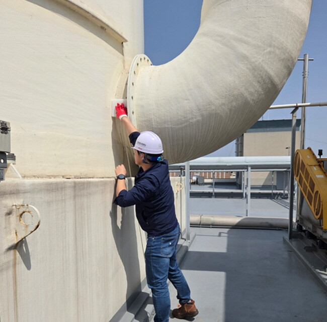 | 인천환경공단 직원이 가좌사업소 분뇨처리시설 악취방지시설의 유입 악취를 점검 및 포집하고 있다. |