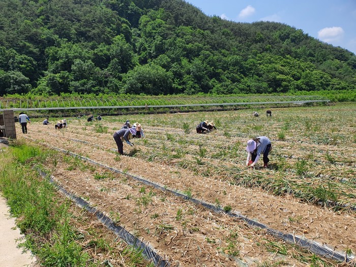 이번 일손 돕기 대상은 용주면 손목리의 일손 부족 농가 두 곳으로 약 500평 정도에 이르는 양파 밭에서 구슬땀을 흘리며 양파 순자르기 및 수확 작업 등을 도왔다.