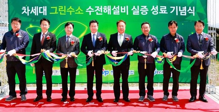 | ▲ 충남 태안발전본부에서 서부발전, 한국에너지기술연구원, 테크로스는 '태양광 발전 연계 변동 부하에 대한 차세대 알카라인 수전해 설비 실증 성공 기념식'을 개최했다. (출처: 한국서부발전) |