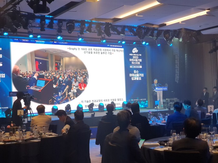 | ▲ [수출부문 수상, 7일 서울 여의도 페어몬트 호텔에서 열린 ‘2023 하이서울기업 페스티벌’ 시상식에서 그래피 심운섭 대표가 수출부문 우수기업 중 대표로 발표하고 있다. (사진=주식회사 그래피)] |