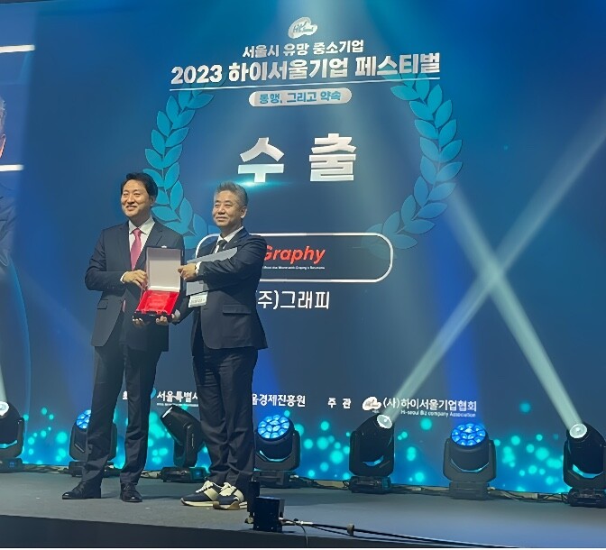 | ▲ [수출부문 수상, 7일 서울 여의도 페어몬트 호텔에서 열린 ‘2023 하이서울기업 페스티벌’ 시상식에서 그래피가 수출부문 우수기업 표창을 수상하고 심운섭 대표와 오세훈 서울시장이 기념촬영을 하고 있다. (사진=주식회사 그래피)] |
