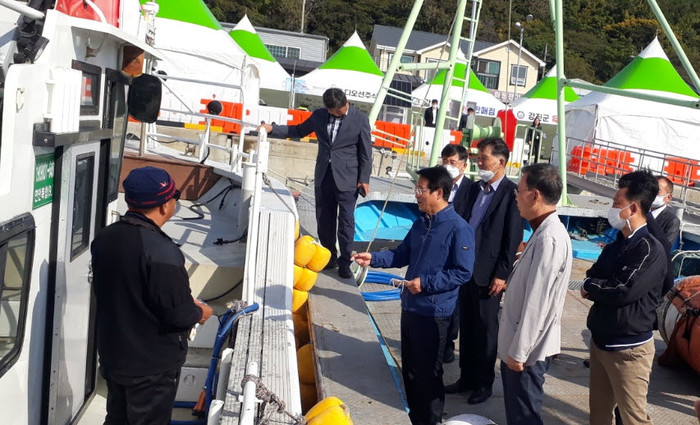| ▲ 지난 10월 28~29일 강진 마량항에서 열린 해양박람회장을 찾은 강진원 강진군수(가운데 )가 전시된 알루미늄 어선을 살펴보고 있다. / 사진=강진군 제공 |
