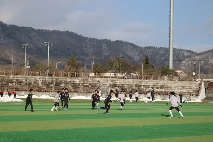 | ▲ 강진군종합운동장에서 2024 동계 초등 축구 전지훈련에 참여한 선수들 / 강진군 제공 |