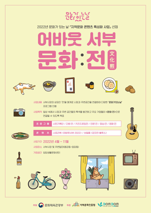 봄봄콘텐츠에서 주관하는 <어바웃 서부 – 문화:전>은 문화체육관광부가 주최하고 지역문화진흥원이 주관하는 2022 문화가있는날 지역문화콘텐츠특성화사업이다. 올해로 2년차에 사업에 들어가는 <어바웃 서부 – 문화:전>은 ‘시민들이 함께 만들어가는 우리 지역의 콘텐츠’라는 슬로건으로 지난해 지역문화진흥원장상을 수상한 바 있다.