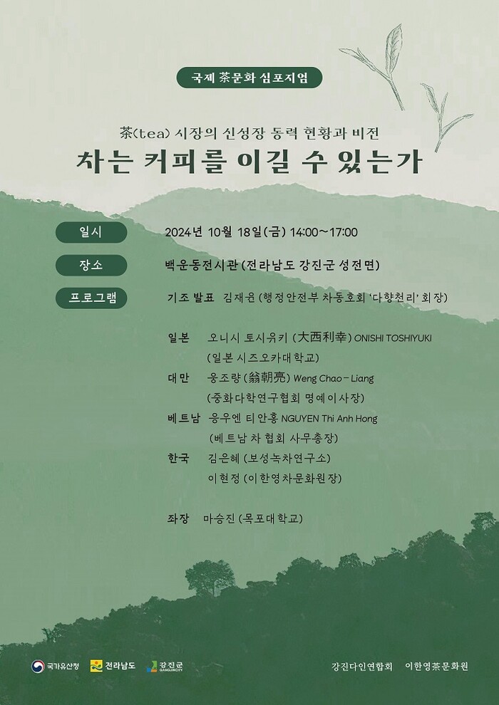 심포지엄에는 행정안전부 차동호회 ‘다향천리’ 김재윤 회장의 기조 발표와 오니시 토시유키(일본 시즈오카대학교), 웅조량(대만 중화다학연구협회 명예이사장), 응우엔 티안홍(베트남 차협회 사무총장), 김은혜(보성녹차연구소), 이현정(이한영차문화원장)의 발표가 이어질 예정으로, 목포대학교의 마승진 교수가 좌장을 맡아 심포지엄을 이끈다. 행사는 강진다인연합회와 이한영茶문화원이 공동 주최한다.