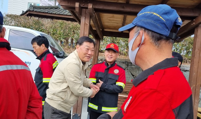 김윤철 군수는 이번 방문에서 주불 및 재발화, 잔불 진화로 힘든 시간을 보낸 산불 전문진화대원들에게 진심으로 감사의 인사를 표했다.