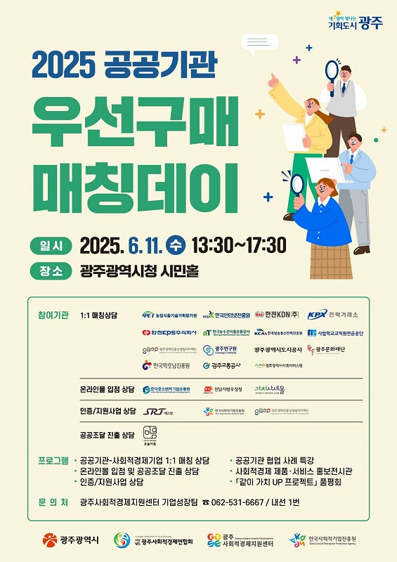 한편 광주시는 공공기관을 직접 찾아가는 우선구매 제도 교육과 사회적경제기업 맞춤형 상담을 제공하는 ‘찾아가는 상담회’를 8월부터 운영할 계획이다. 이를 통해 공공구매 연계를 일상화하고, 사회적경제제품 우선구매제도의 실효성을 높여나갈 방침이다.