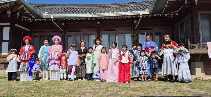 | ▲ 강진군가족센터에서 지난 28일 열린 다문화가족 어울림 나눔 행사 중 다문화 의상 패션쇼 후 기념 촬영을 하고 있다. / 강진군 제공 |