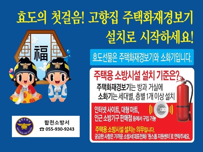 합천소방서(서장 김진옥)는 설 명절을 앞두고 주택용 소방시설 설치 촉진을 위해 ‘고향집, 주택용 소방시설 선물하기’ 홍보 캠페인을 오는 2월 2일까지 다중밀집시설을 대상으로 비대면 방식으로 실시한다고 밝혔다.