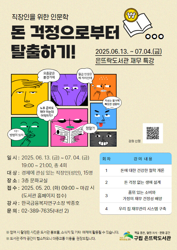 구립 은뜨락도서관 관계자는 “돈 걱정과 노후 준비 불안에 지친 직장인들이 재무관리 수업을 통해 돈의 주인으로 사는 방법을 익히고, 소비의 함정에서 벗어나 경제적 안정을 느낄 수 있는 시간이 되길 바란다”라고 말했다.