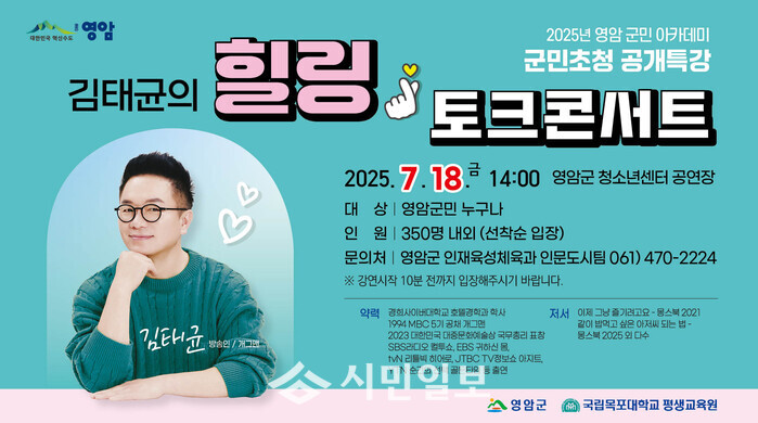 노재영 영암군 인재육성체육과장은 “바쁜 일상에서 잠시나마 마음의 여유를 찾고, 이웃과 공감대를 형성하는 시간을 마련했다. 김태균 씨의 유쾌한 에너지를 공유할 영암군민의 많은 관심과 참여 바란다”고 말했다.